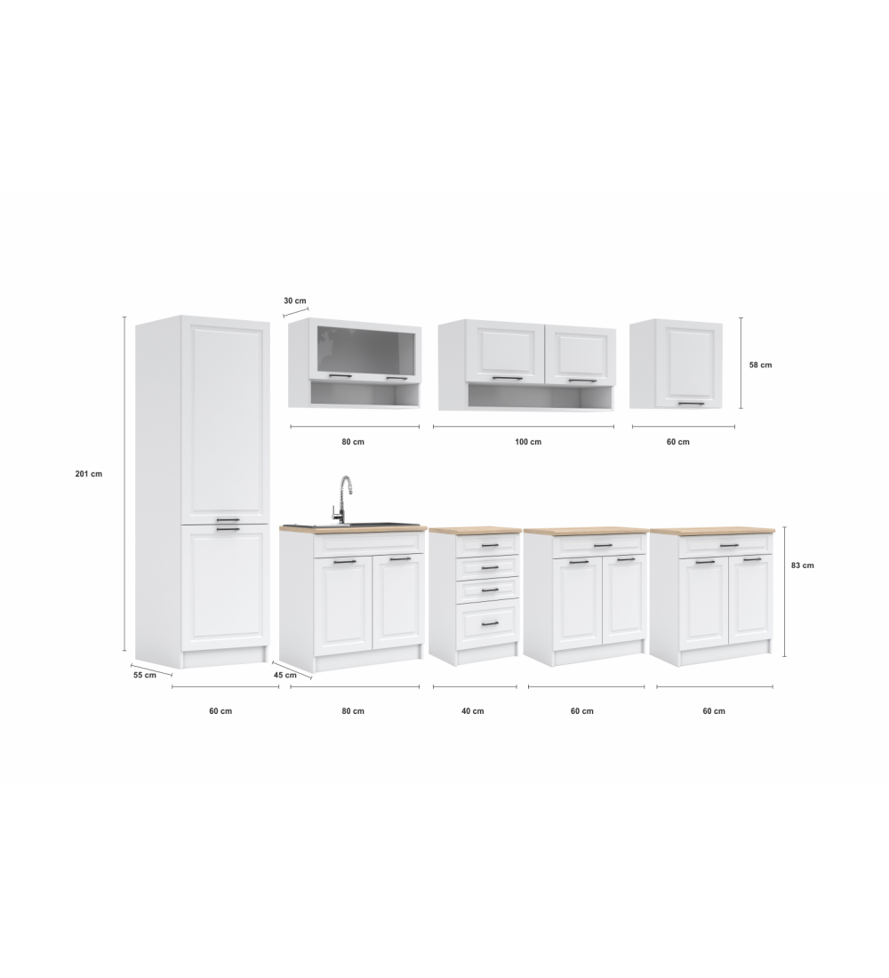 - Na dřezové skřínce není pracovní deska - možnost dokoupit pracovní desku +80cm nebo dřez, který je přes celou džezovou skřínku